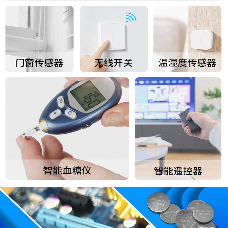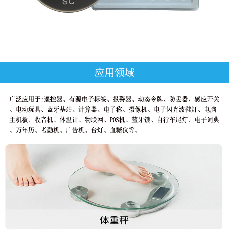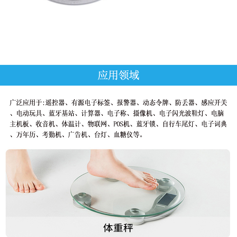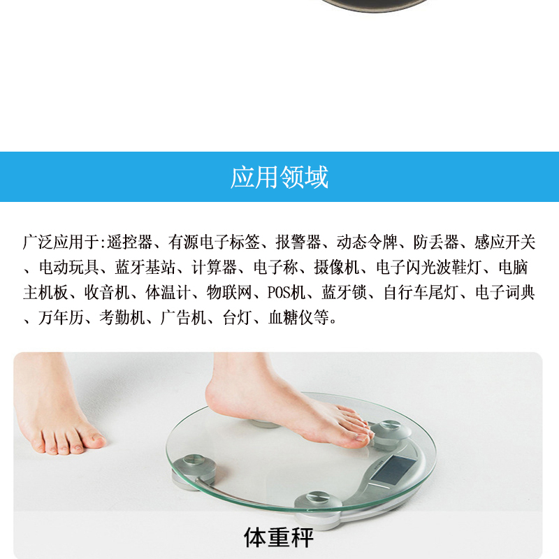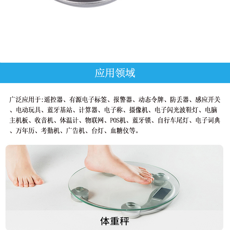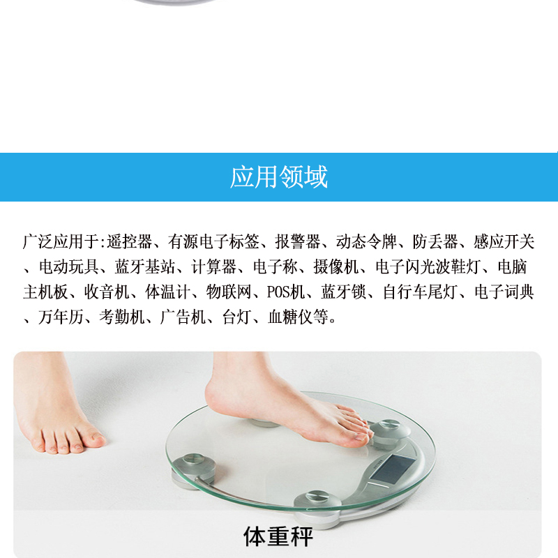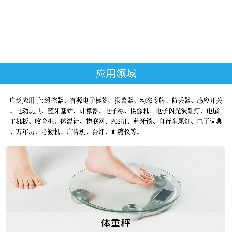 用途:可用于電子玩具、藍牙無線產品、手表、計算器、汽車防盜遙控器、電子稱、攝像機、電子閃光波鞋燈、電腦主機板、收音機等等。